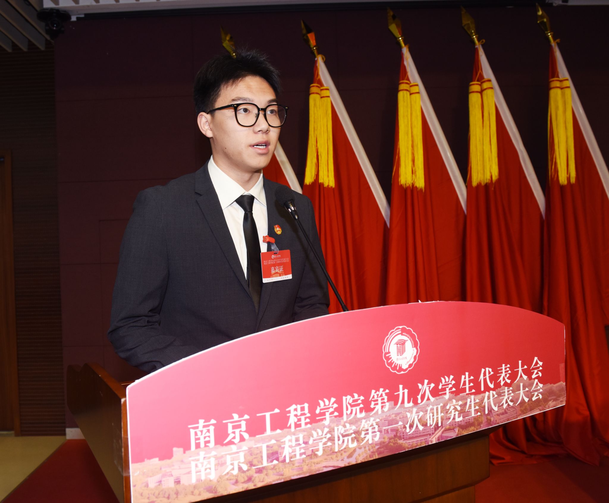 河海大学席皓代表兄弟高校学生会组织致辞。他表示,河海大学学生会愿与南工程学生会组织携手共进、交流经验,共同为全省高校学生会工作做出更大贡献。
