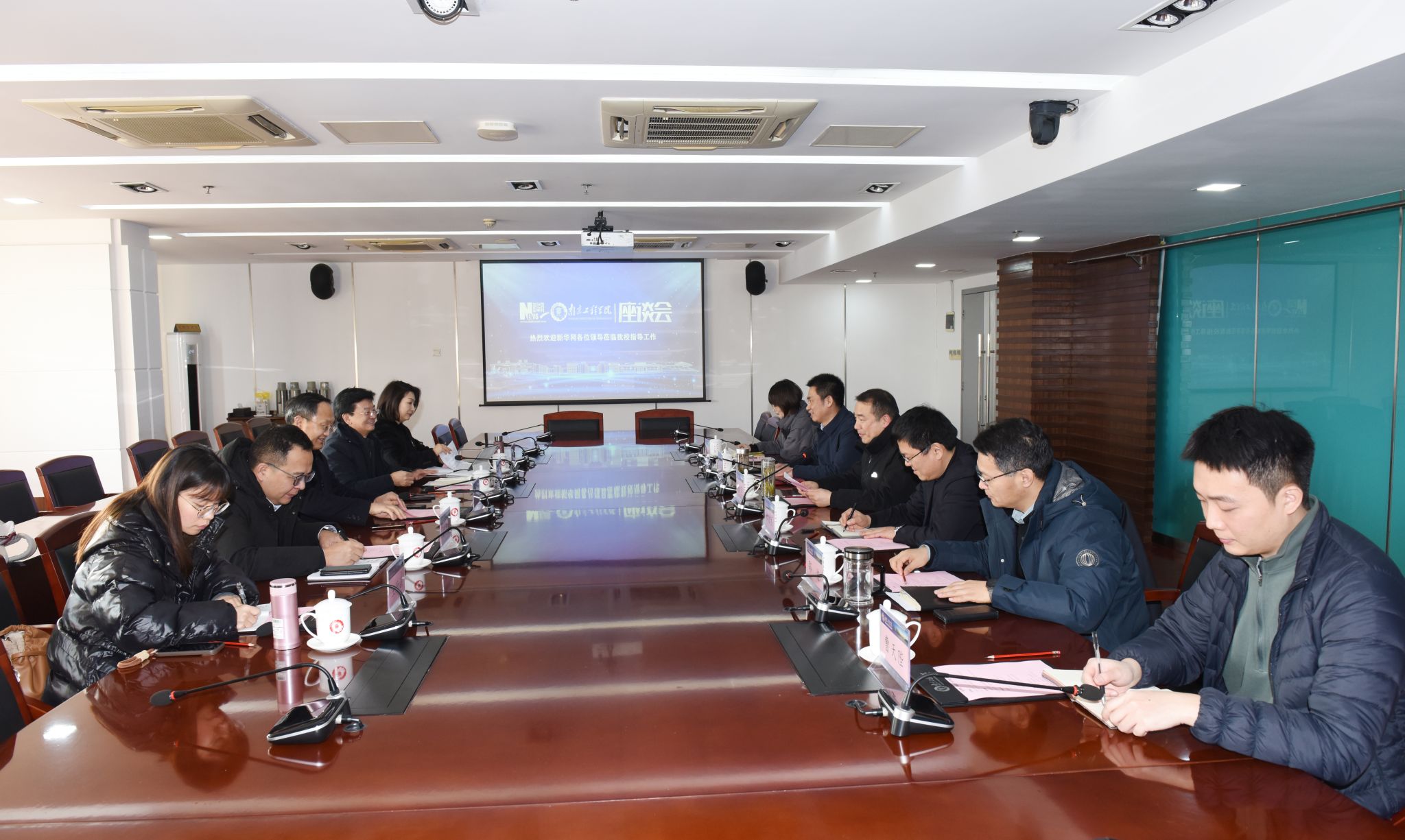 1月24日下午,新华网总裁助理、长三角中心主任徐寿权,长三角中心执行主任彭亚平,江苏频道主编吴新生,江苏公司教育事业部总监张海燕,江苏公司教育事业部主管王雨涵等一行五人来校调研交流。党委书记孙爱武,党委副书记濮励杰,党委常委、宣传部部长陈建华热情接待了来宾并座谈。
