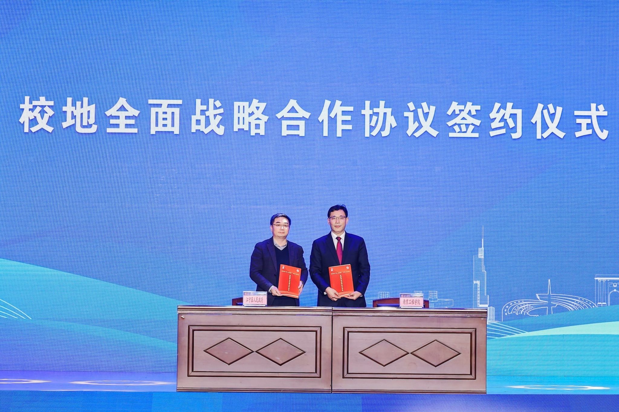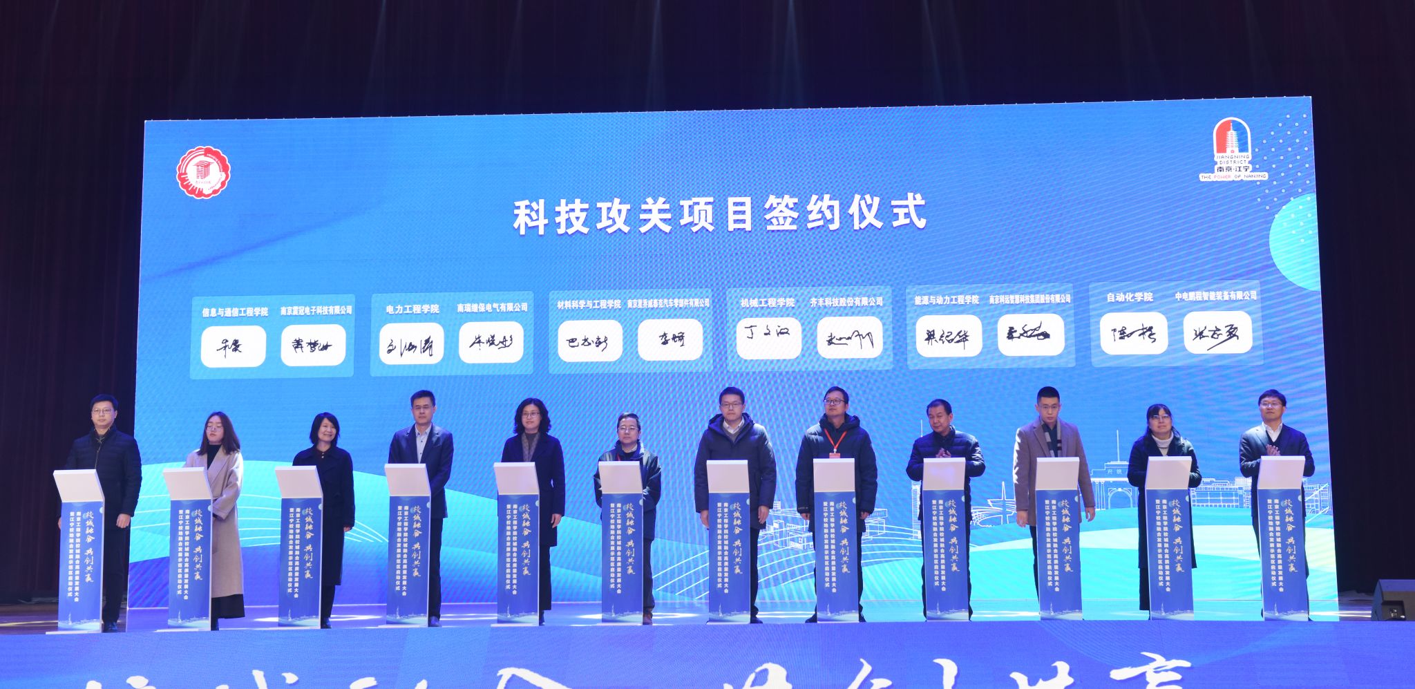 在与会人员的共同见证下,张仰飞与黄成文分别代表校地签订全面深化战略合作协议。江宁校地融合发展示范区同时正式启动,双方将整合南工程应用型高校的科教资源优势和江宁区的产业优势,以现有的新型研发机构、高等级平台、科技创业企业、大学科技园、技术转移中心、知识产权运营中心、产业学院和地方产业急需高水平应用型人才培养为基础,建成立足江宁、南京,辐射江苏的政产学研用为一体的校地融合发展示范区,打造全省领先、全国知名的校地融合发展典范区,共建“世界电谷”。