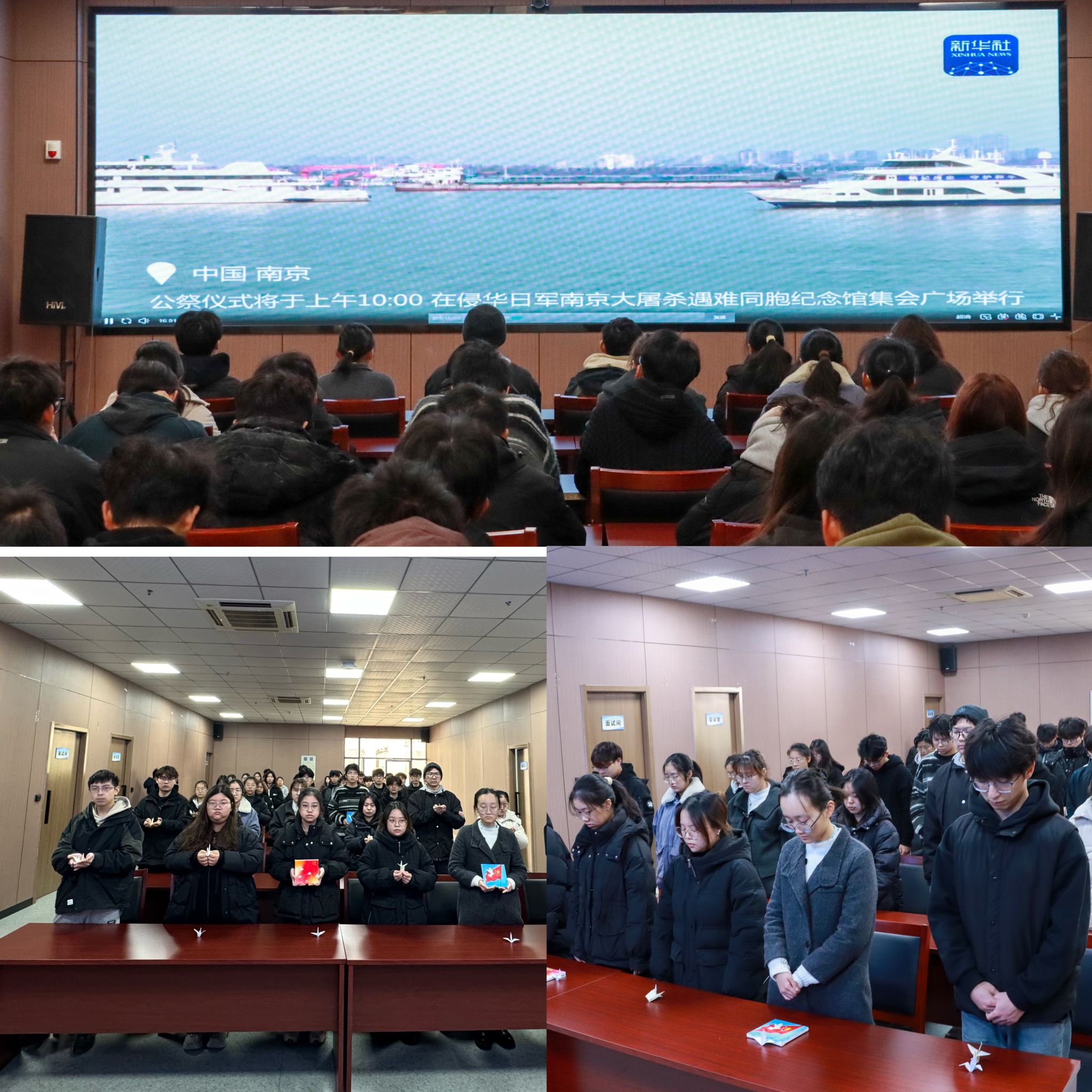 上午10点,学生干部代表齐聚至馨苑·综合服务二楼就业多功能厅,集中观看南京大屠杀死难者国家公祭仪式现场直播,共同回望历史,追忆逝者,缅怀先烈。