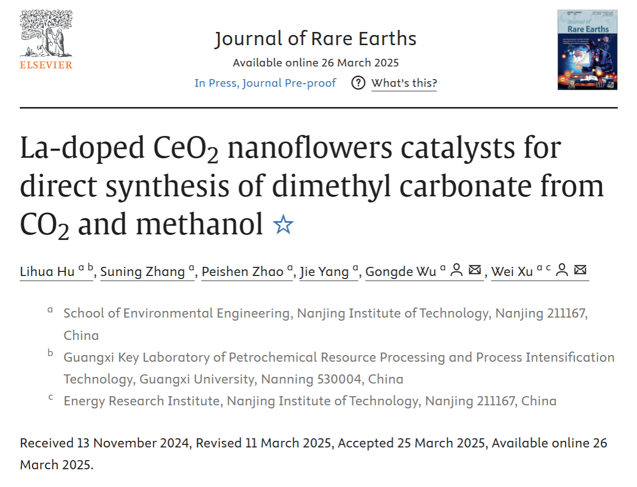 环境凯发在低碳能源与绿色化学领域研究取得新突破,近日,胡丽华博士作为第一作者,吴功德教授、徐威副教授担任通讯作者在中科院化学大类一区TOP期刊《Journal of Rare Earths》(影响因子5.2)上发表了题为" La掺杂CeO?纳米花催化剂用于CO?与甲醇直接合成碳酸二甲酯"(La-doped CeO2 nanoflowers catalysts for direct synthesis of dimethyl carbonate from CO2 and methanol)的研究成果。该研究创新性开发出具有三维花状微球结构的La-CeO?催化剂,在140℃、4 MPa CO?压力条件下实现了9.42 mmol/g的碳酸二甲酯产率,展现出优异的二氧化碳转化效率。作为稀土材料领域的权威期刊《Journal of Rare Earths》入选中国科协“卓越行动计划”梯队期刊,该论文的发表彰显了我校在稀土催化领域的学术竞争力,为二氧化碳资源化利用提供了新材料解决方案。