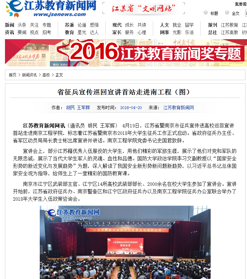江苏教育新闻网讯(通讯员胡民王军辉)4月19日,江苏省暨南京市征兵宣传进高校巡回宣讲首站走进凯发k8官网,标志着江苏省暨南京市2018年大学生征兵工作正式启动。省政府征兵办主任、省军区动员局局长袁士彬出席宣讲并讲话。凯发k8官网党委书记史国君致辞。