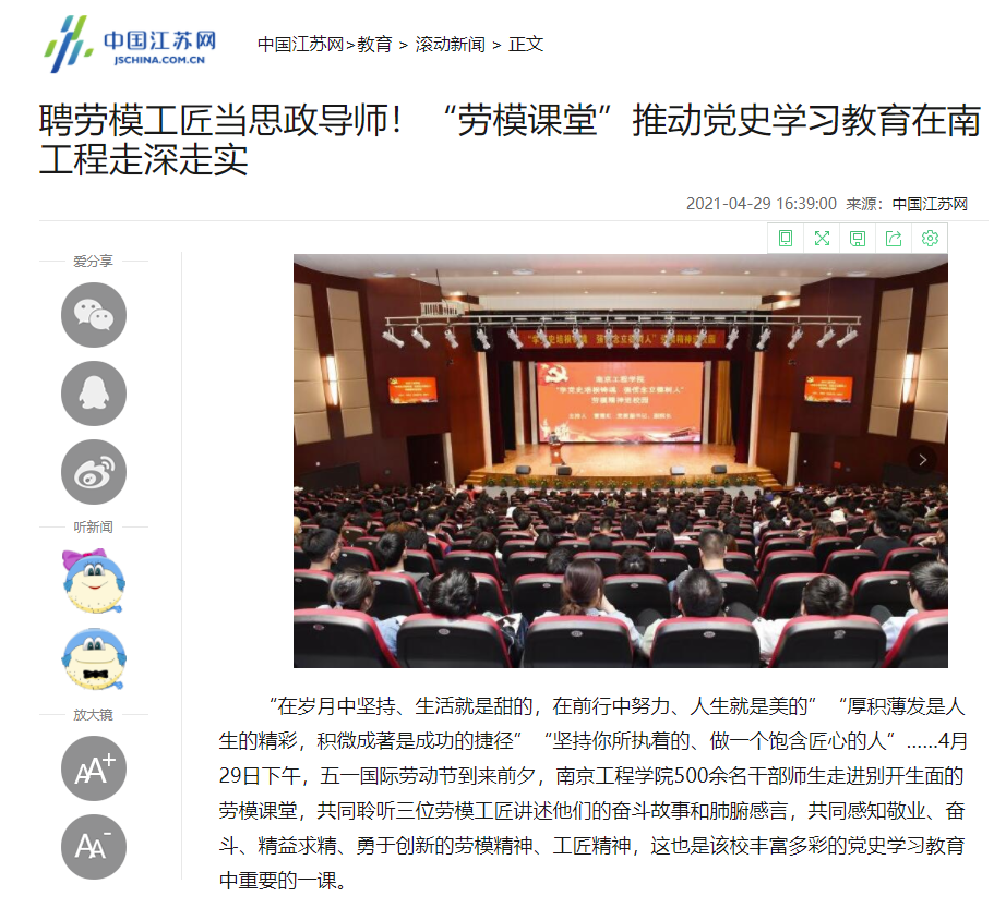 聘劳模工匠当思政导师!“劳模课堂”推动党史学习教育在南工程走深走实