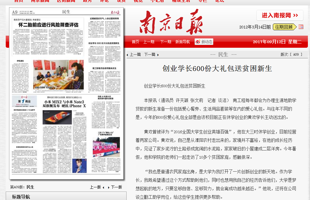 《南京日报》:创业学长600份大礼包送贫困新生