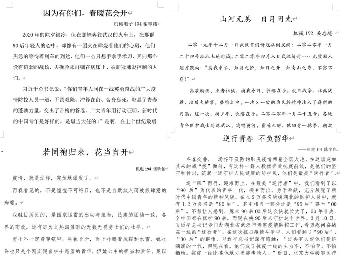 活动得到了全院学生的积极响应,线上总计收到100多份作品。作品形式多样,既有心得体悟、手抄报等传统类型,也有小视频等创新形式。谢琴绪同学笔下的白衣天使,纵使病毒肆虐,亦要奋战前线;陈宇翔同学笔下的“逆行者”,扎根基层、毫无畏惧、逆行而上;吴佳同学笔下的“中国精神”,延伸在天空与大地,闪耀在奉献和坚守,岁月不曾静好,有人负重前行。同学们用纸笔,谱写着神州大地那些抗“疫”感人的故事,也抒发了春天到来的美好希冀。最终,经过评选,机电191陈宇翔、机械182高梦同学获得一等奖,装备171吴佳等6名同学获得二等奖,机电193谢琴绪等10名同学获得三等奖。